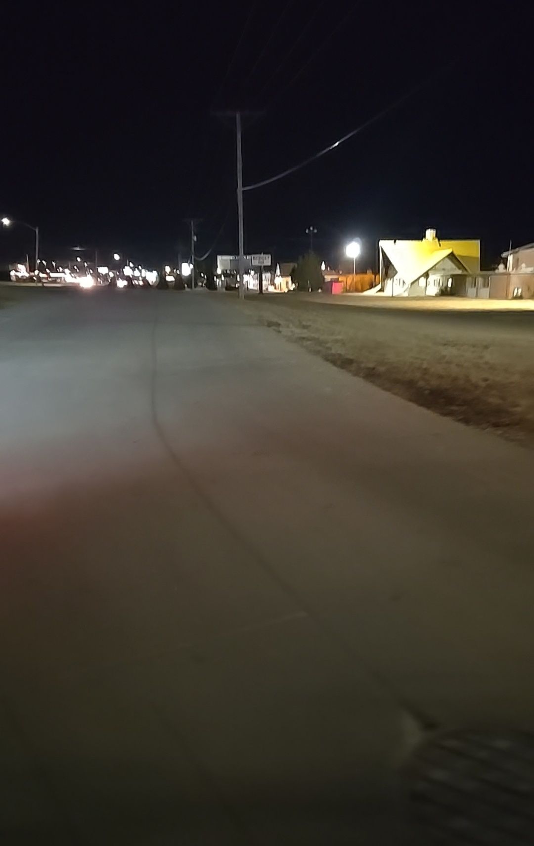 Buildings with corrugated siding along a gray paved road, under a cloudy sky.